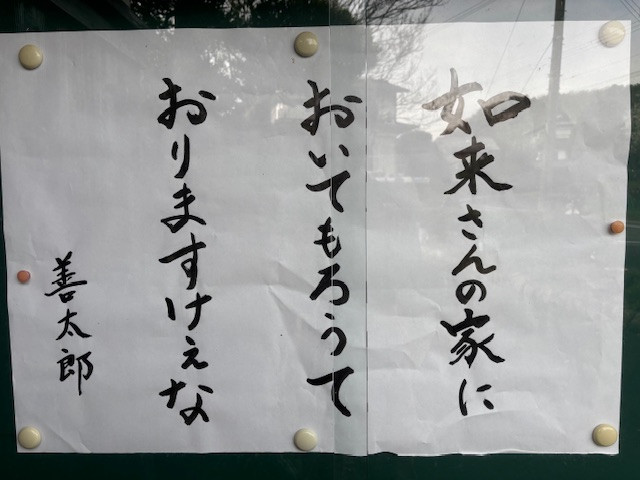 当時、借家に住んでいた善太郎さんは、心はすでに阿弥陀如来様の慈悲の中にあり、この身は如来様によって生かされている(如来の家においてもらっている)という感謝と法悦の境地をこの言葉に表されたのであります。